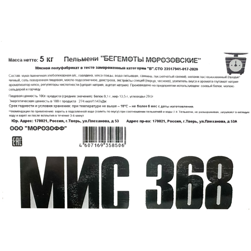 Пельмени Бегемоты Морозовские весовые /МОРОЗОФФ ТМ/
